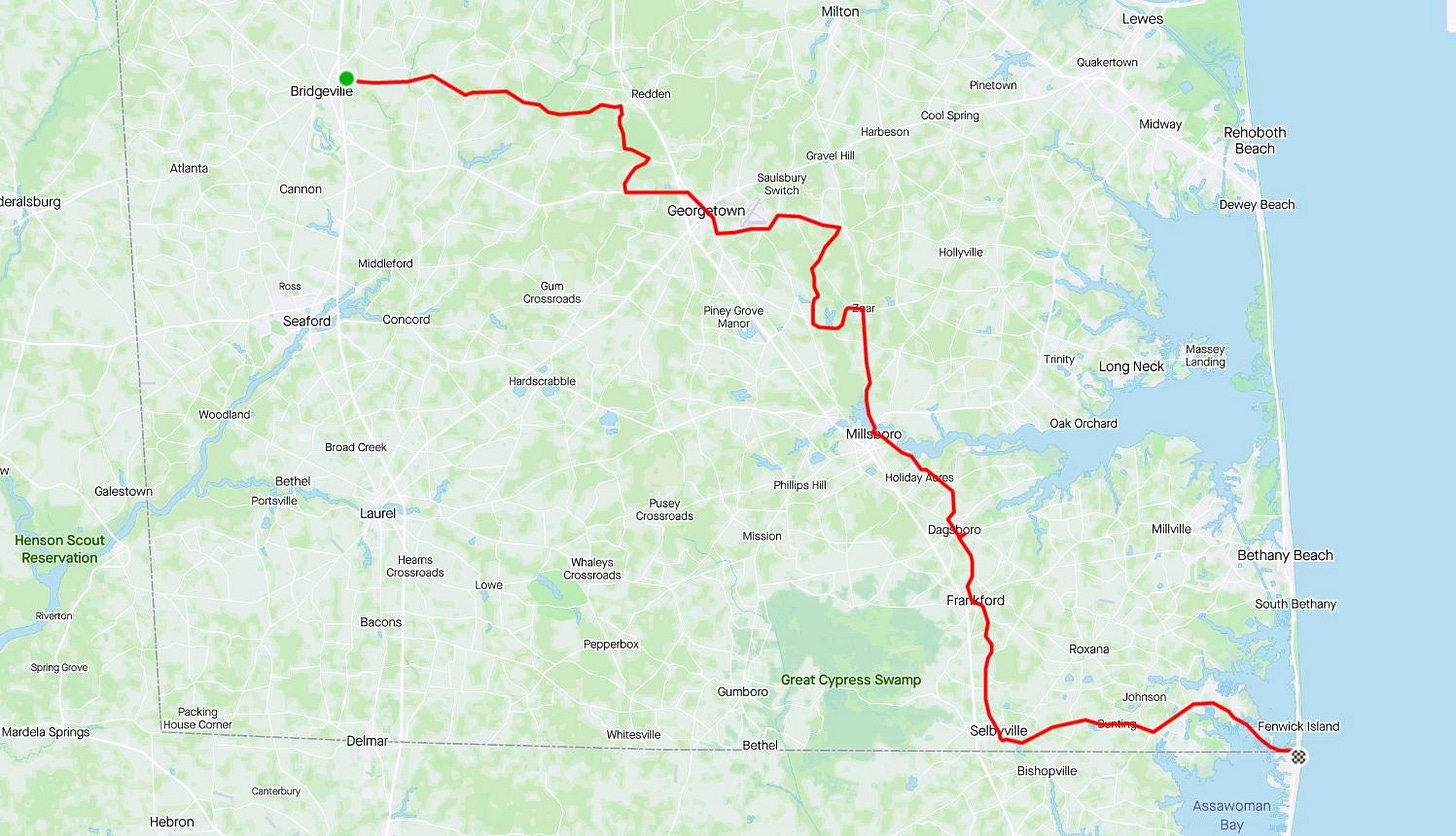 Admittedly, it wasn’t clear at first that this would be the case. The segments the app strung together had us beginning in Bridgeville, a town with a population of 2,366 and a square mileage of 4.82, and taking a series of remote roads eastward to Fenwick Island (just south of Bethany Beach on the East Coast).