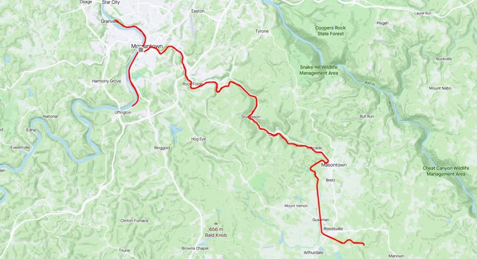 Route: Deckers Creek Trail, Capteron Trail, (South) Mon River Trail